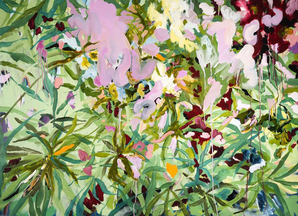 She works intuitively, allowing colors to bleed together and slowly bloom. Through evolving layers and abstractions, she hopes to capture the elusive, transcendent essence of her subjects. She believes the use of abstraction gets us beyond appearances and closer to the way things truly are.