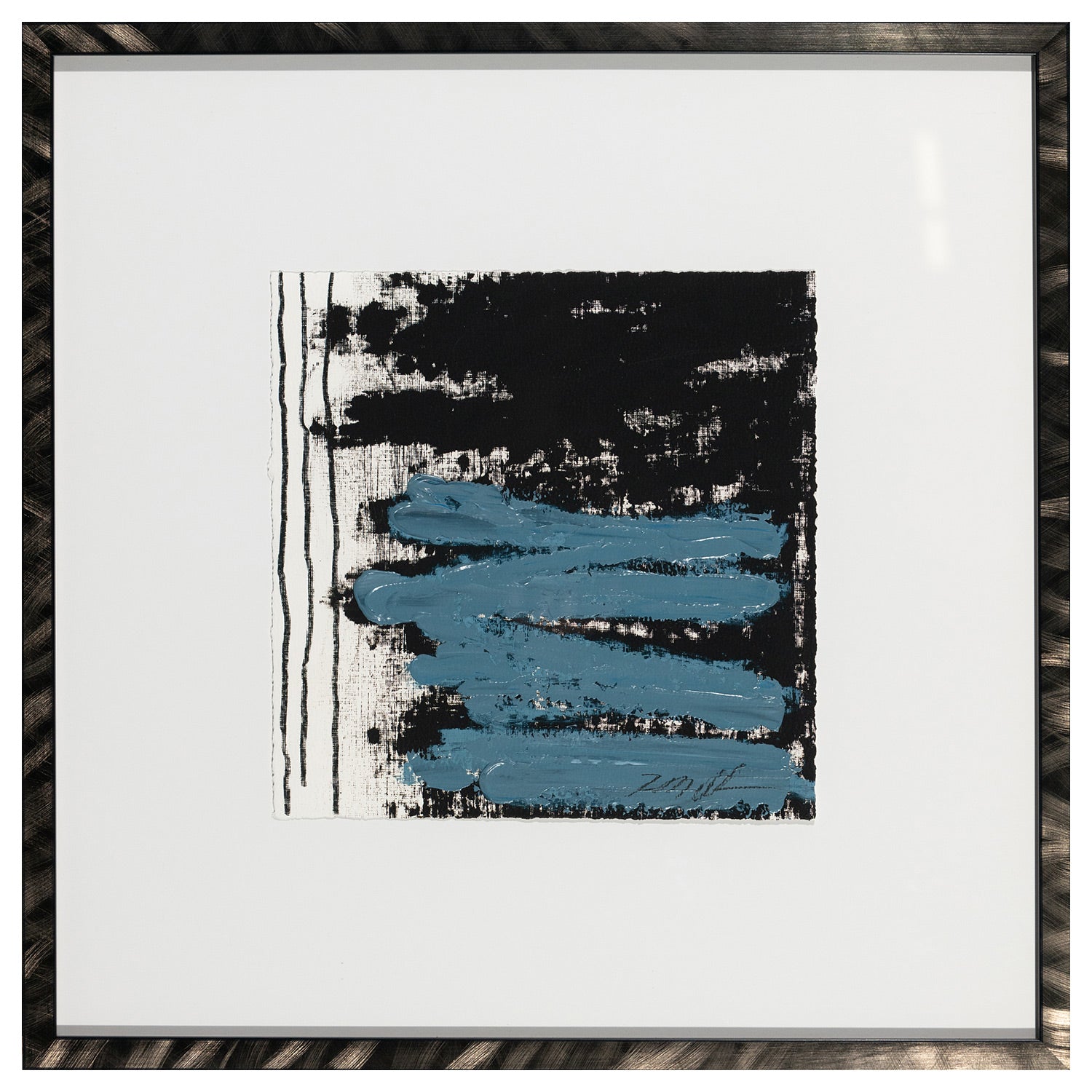 3 Lines is a hand-embellished giclée on fine art paper that presents a refined blend of simplicity and depth through a minimalist yet expressive structure. The captivating painting features three bold horizontal blue brushstrokes layered over a black and white textured backdrop which create a striking contrast. Its minimalistic design allows the viewer to concentrate on the movement and depth within the brushwork.