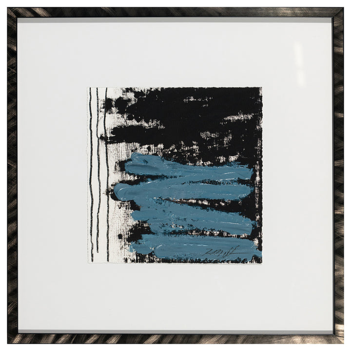 Mounted within a sleek black frame with white matting, 3 Lines exudes the themes of balance, rhythm and meticulous spontaneity. It’s a perfect statement piece for a modern setting that invites viewers to interpret its narrative in their own way.
