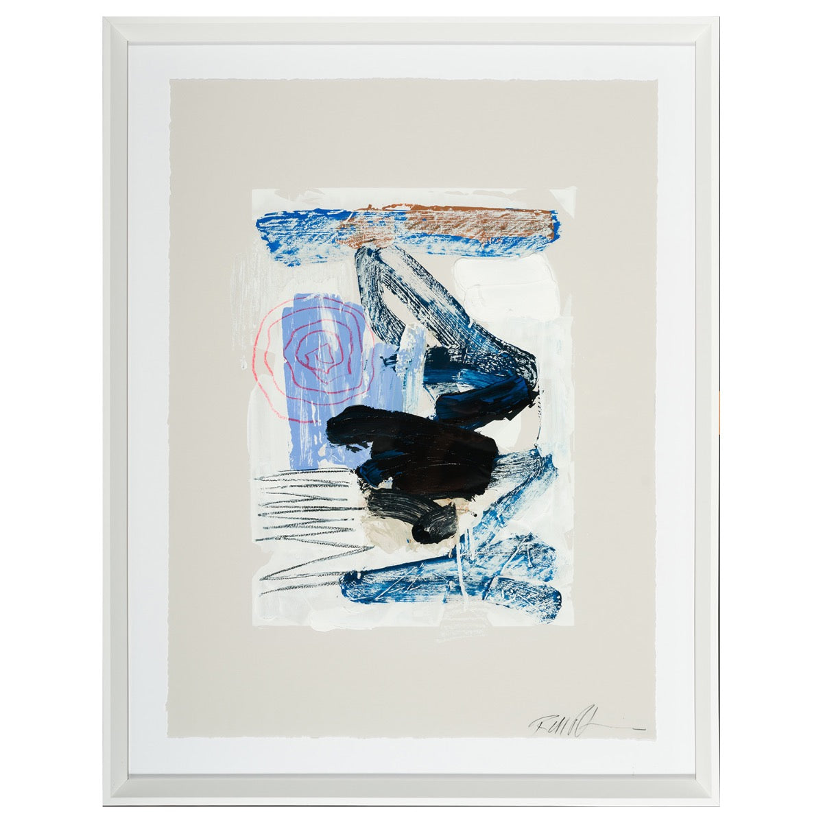 Front Wall Studies 3 created by a renowned artist Robert Robinson, is a hand-embellished giclée on fine art paper that features a dynamic interplay of blue, black, white and brown brushstrokes. The red spiral, blue brushstrokes and black smudges add a layered and textured aesthetic creating an engaging and thought-provoking composition that draws the viewers in. The contrast between structured form and expressive brushstrokes adds depth and movement to the piece.