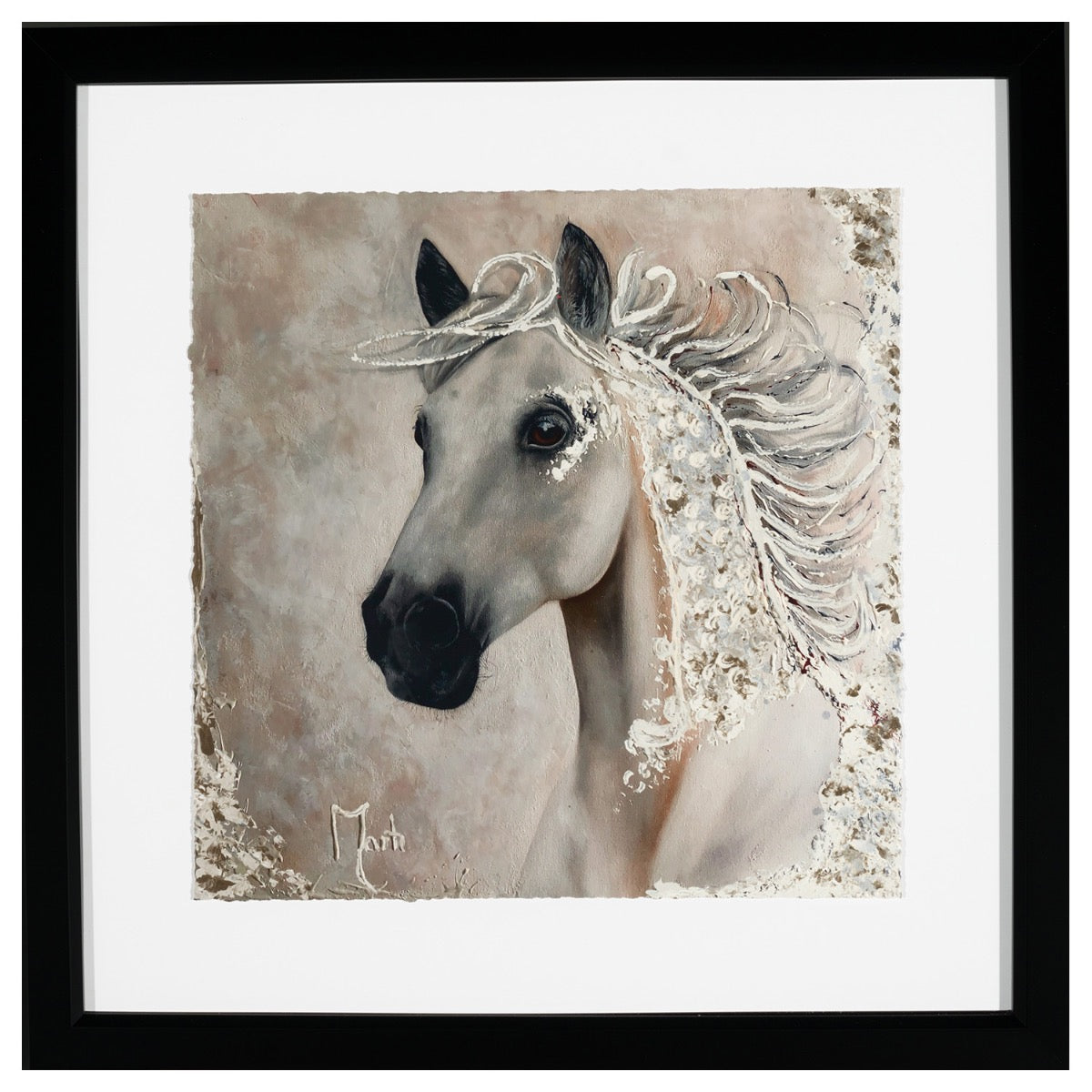 Hand-embellished giclee on fine art paper. Size includes frame.