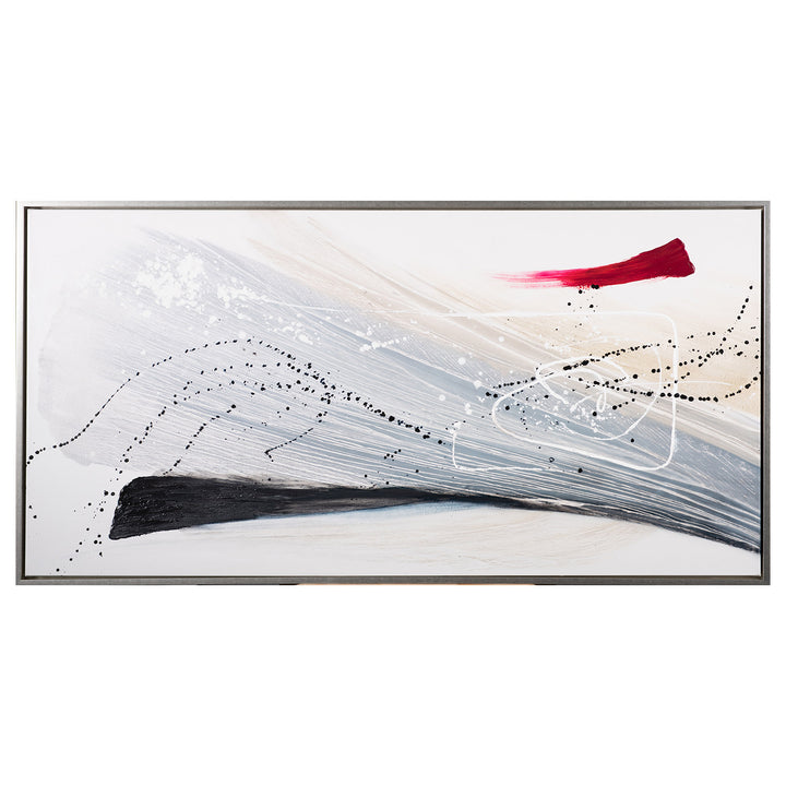 Enhance the beauty of your modern space with Ambrosious, a hand-embellished giclee on canvas that showcases a dynamic fusion of movement and contrast. The striking composition is featured with sweeping brush strokes of white, gray and black tones creating a sagacity of fluid motion that hypnotizes the eye. The black dots randomly scattered across the canvas and textured lines add depth to the composition whereas the bold stroke of red in the upper right corner offers a commanding contrast that injects liveliness into the piece.