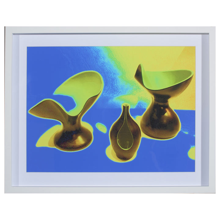 Blue Vases is a giclee print on fine art paper presenting a striking relationship of earthy tones and vibrant contrasts. This modern wall décor artwork features three abstract forms looking like vase in shades of brown and yellow rendered on a dynamic backdrop of blue and green creating a visually engaging effect. The background’s gradient effect transitioning from vibrant blue to soft green and deep yellow enhances the depth and movement within the structure.