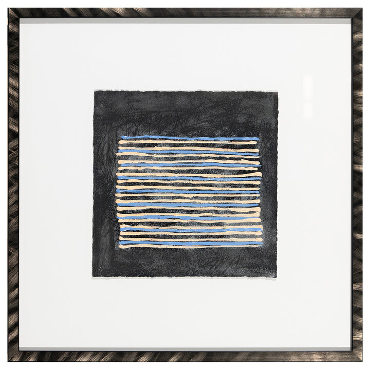 Bottom Line is a hand-embellished giclée on fine art paper that features a textured black backdrop along with uneven parallel lines in alternating hues of blue and beige adding a vibrant and organic feel to the structure. The refined combination of minimalism and expressive texture creates a sense of movement and depth that attracts the viewer’s gaze.