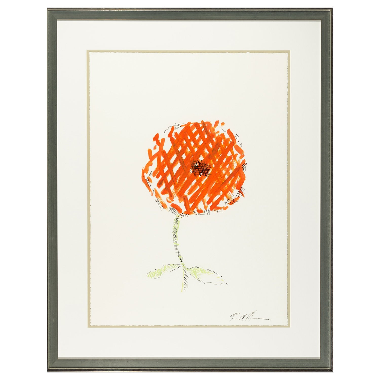 Crosshatch Flower is a hand-embellished giclee on fine art paper that presents a prominent floral design rendered with cross-hatch technique. The fascinating painting features a flower portrayed with orange and black intersecting lines which form its petals, whereas the green cross-hatch lashes shape the stem and leaves. Its minimalistic design and intricate line work enhance its contemporary appeal that draws the viewer’s gaze.