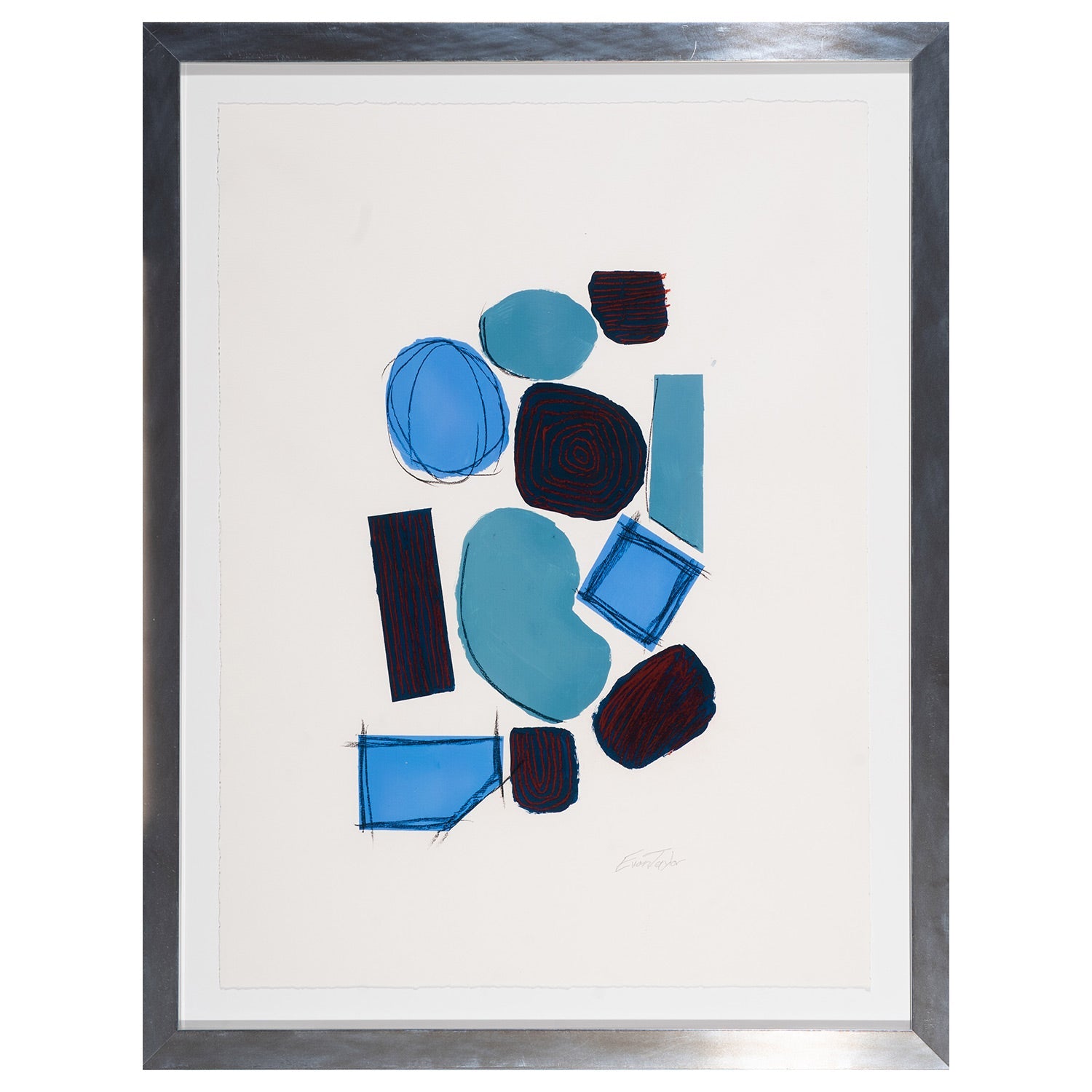 Fish is a hand-embellished giclée on fine art paper that showcases a harmonious blend of shape, texture and motion created by a renowned artist Taylor Evan. This fascinating abstract piece of artwork features dynamically arranged geometric forms in blue and black shades, accentuated with red patterns that create a striking visual effect. The masterpiece is composed with rectangles, squares, ovals and irregular shapes, producing a visually attractive balance between structure and spontaneity.