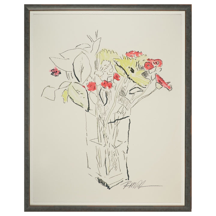 Flowers for Tillie is an abstract hand-embellished giclee on fine art paper skillfully created by a renowned artist Robinson, Robert. This framed piece of artwork exudes a vibrant and dynamic energy through its composition of sketch-like strokes and bold black outlines. It features an illustration of a lively bouquet of yellow and red flowers set against a textured white background that draws the viewers into the vibrant world.