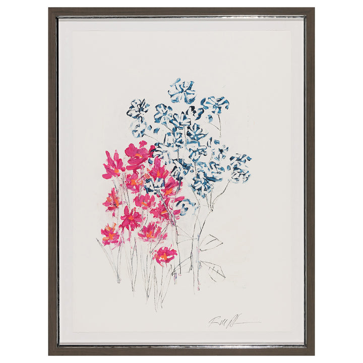Flowers for You, is a lively and expressive floral painting that presents a dynamic bouquet of pink and blue flowers having delicate stems and leaves sketched in a minimalistic style set against a plain background. The expressive brushstrokes and vibrant colors palette produce an energetic and engaging structure that makes the piece visually appealing.