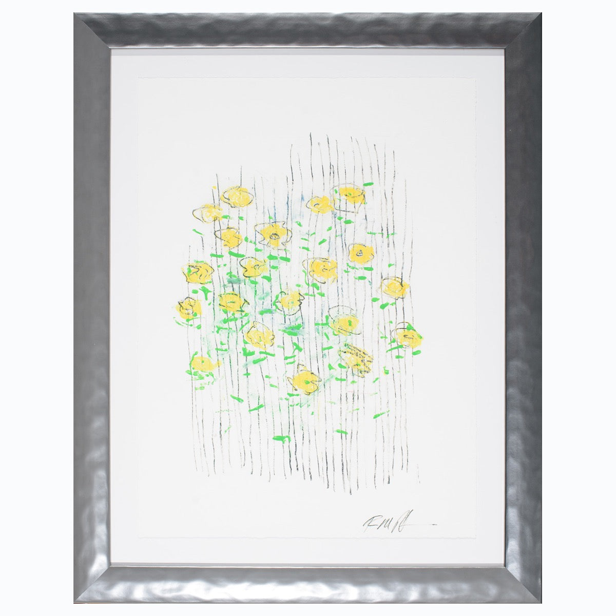 Flowers from the Garden 1, is a hand-embellished giclee on fine art paper that celebrates allure of nature in an impressionistic style. The fascinating floral artwork structures a series of subtle yellow flowers that seem to almost glow with warmth and energy. Soft, fluid brushstrokes define each bloom creating a sense of spontaneity, and hints of green enhance a natural contrast.