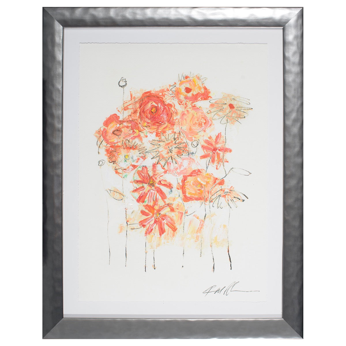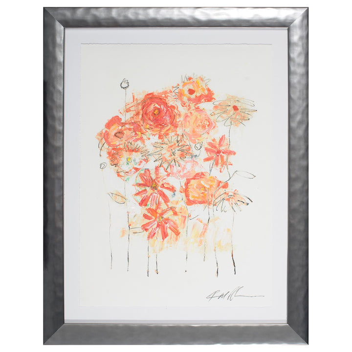 Flowers from the Garden 2, is a hand-embellished giclee on fine art paper that offers a vibrant embrace of nature’s cheerfulness. The striking piece of artwork features a bouquet with flowers rendered loosely against a white background in a warm tone of orange, red and pink. The use of expressive and delicate brushstrokes suggests the momentary beauty of a garden in full bloom.