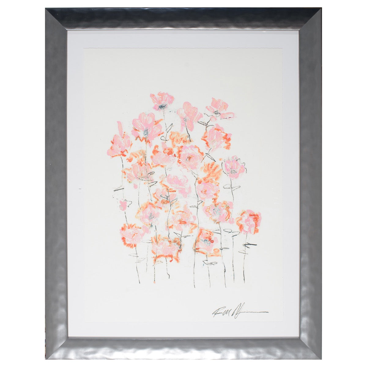 Elevate your spaces with Flowers From the Garden 3 a hand-embellished giclee on fine art paper that brightly celebrates nature's ephemeral beauty through its floral composition. The masterpiece of artistry features soft expressive brushstrokes converging into gentle blooms and leaves with harmonious palette. Accents of pinks, peach and delicate greens tones intermingled against a light background adding a touch of spontaneity and contrast.