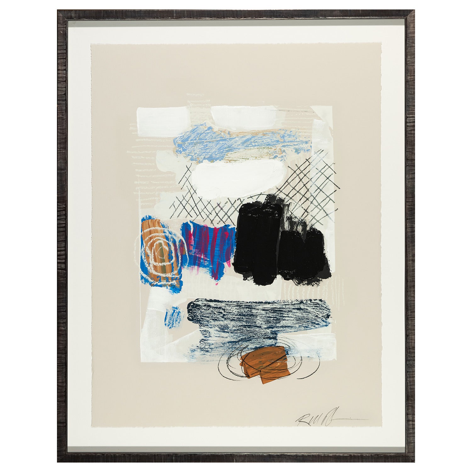 Front Wall Studies 4 is a hand-embellished giclée on fine art paper that presents modern expression through an abstract fusion of color and form. The composition is featured with layered brushstrokes of blue, black, white and brown hues along with cross-hatching swirls and textured patterns all set against a light background, creating depth and complexity. Whereas a red spiral and black smudges heighten the contrast that creates a visually engaging effects.