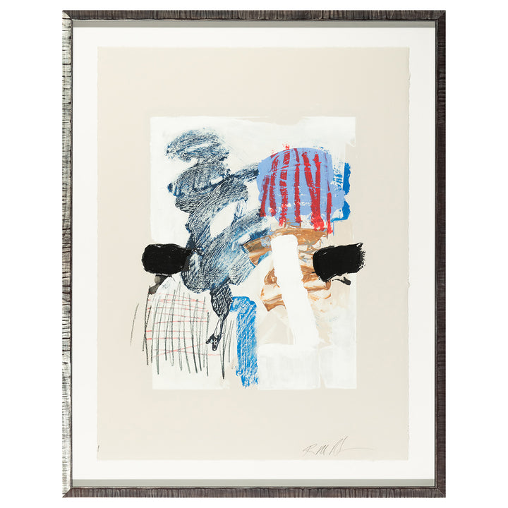 Front Wall Studies 5 is a hand-embellished giclée on fine art paper that depicts an energetic interplay of blue, red, black and white brushstrokes on a textured background. This abstract creation of artistry is featured with grid-like patterns in the lower left corner and stripy elements in the upper right creating a visually engaging and expressive structure. The contrast amongst structured elements and flowing shapes induces a sense of movement and depth.