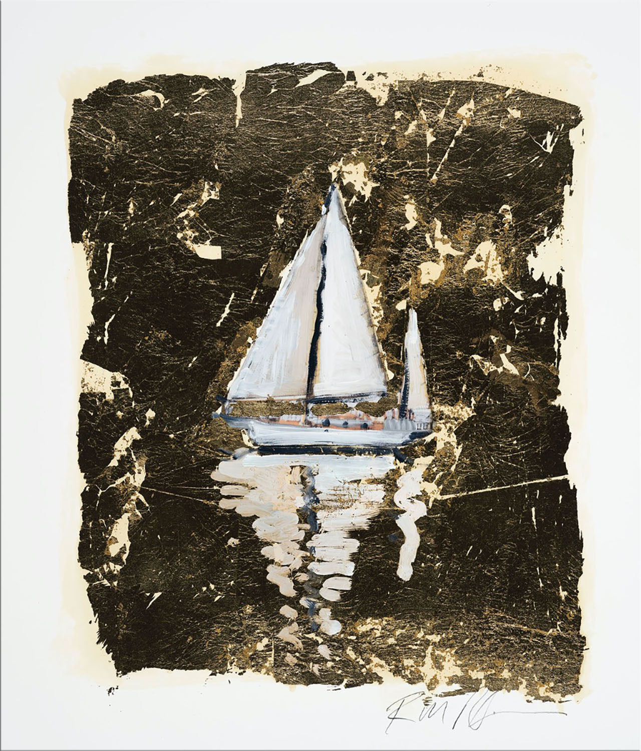 This hand-embellished painting embodies ambition and exploration, inviting observers to imagine sailing toward new discoveries. The reflective water, textured background and centrally positioned sailboat balances the composition. The arrangement of elements sustains coherence within the atmosphere. Gold Coast Boat 4 is ideal for sailors and maritime enthusiasts.