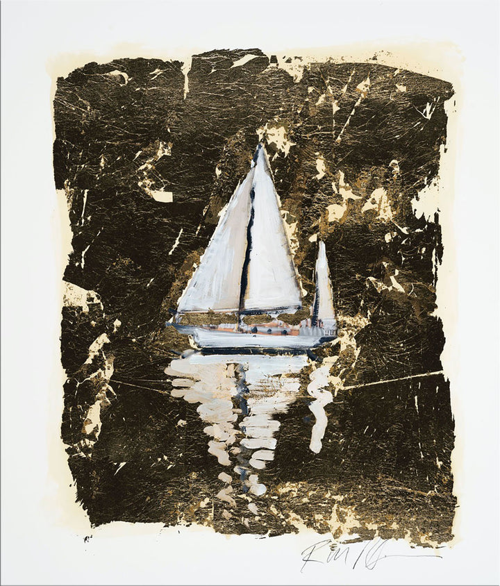 Gold Coast Boat 4 is a striking and elegant artwork showcases a sailboat with crisp white sails dominates the composition set against black and golden background. The water reflection beneath the sailboat adds richness and accuracy to the masterpiece. The contrast between the background and detailed boat creates a breathtaking effect.