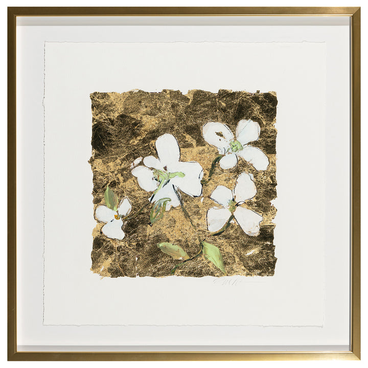 Gold & Dogwood is a giclee on fine art paper hand-embellished with gold leaf that features a delicate yet expressive floral composition. The captivating creation of artistry presents white dogwood blossoms with expressive brushwork set against a textured gold backdrop that creates a visually engaging structure. The contrast between the soft floral elements and the rich gold texture induces a sense of grace and sophistication.