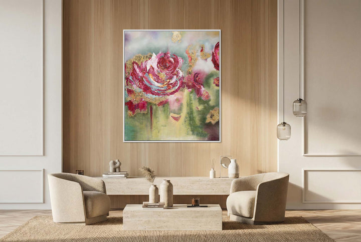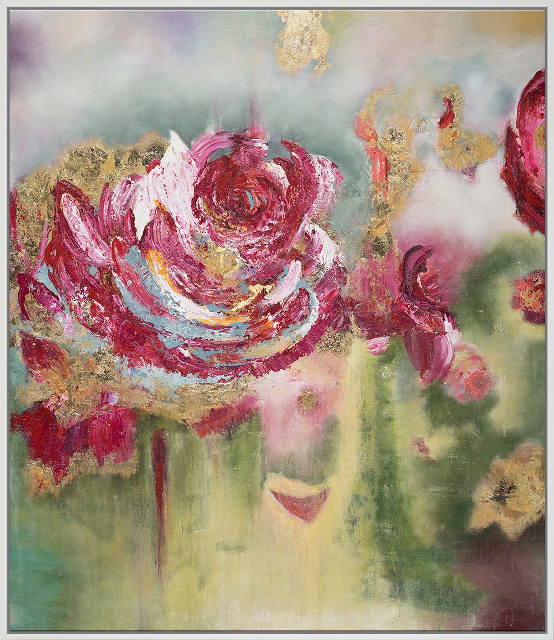This elegant giclee print on gallery-wrapped canvas is hand embellished with gold leaf and framed in a white wooden floater frame.