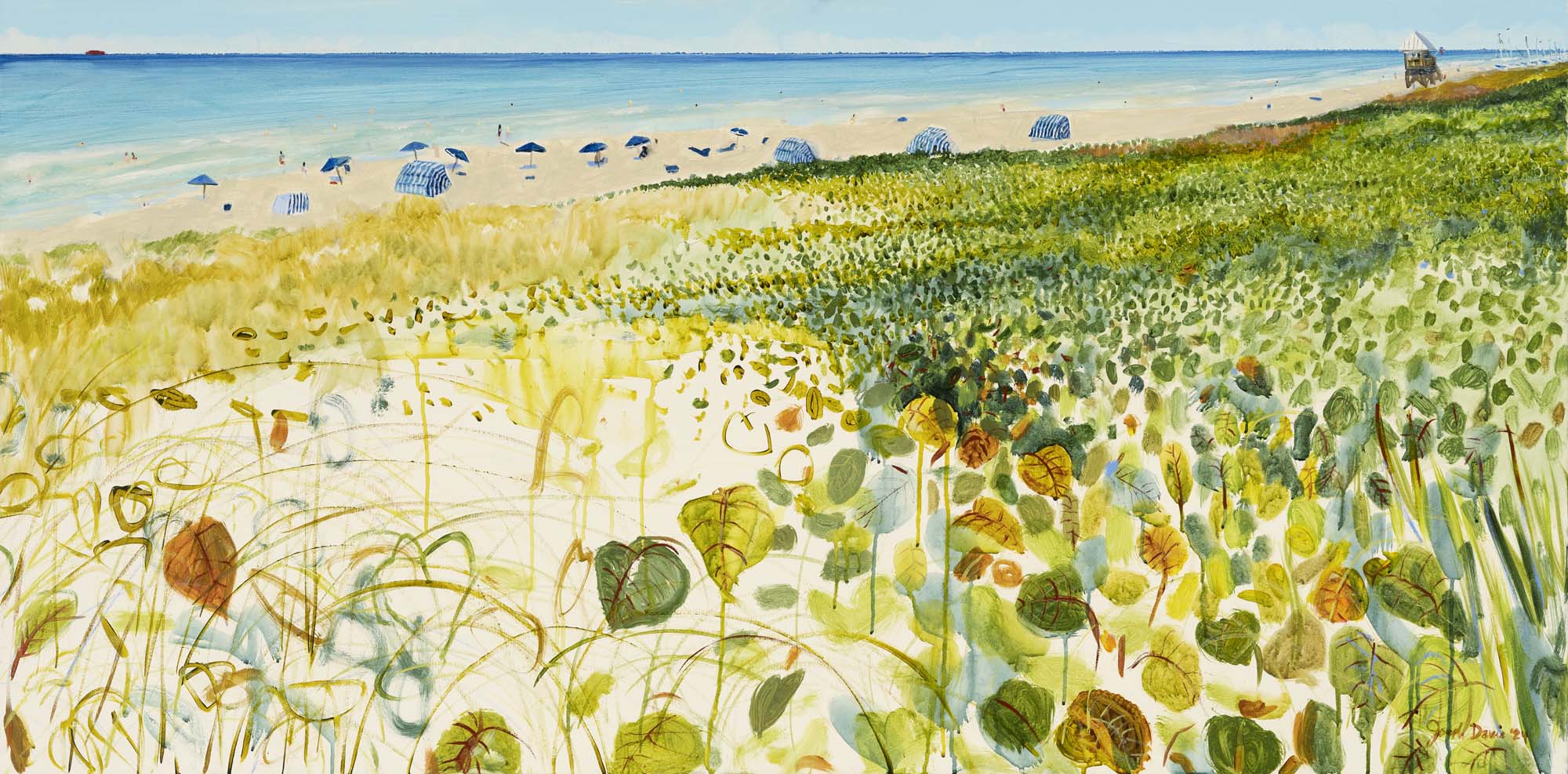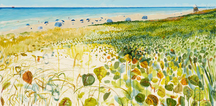 This hand-embellished giclée on gallery-wrapped canvas features a vibrant beach scene seen through a foreground of sea grapes.