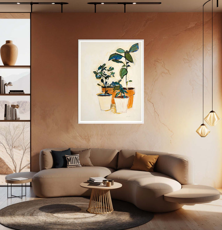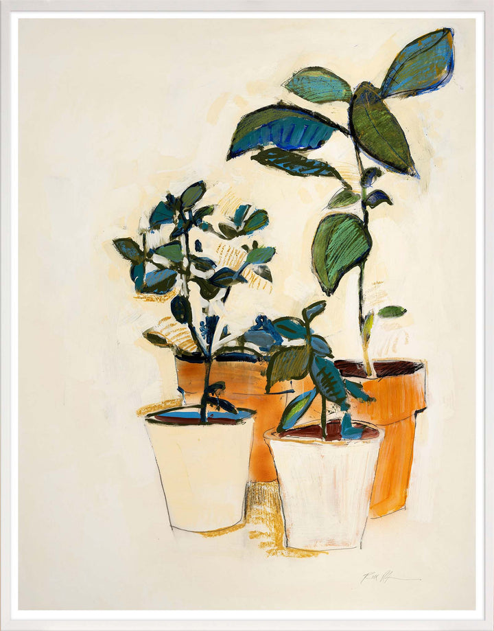 A collection of potted herbs in pots forms this hand-embellished giclee print by artist Robert Robinson framed in a white, cap-style, wooden frame.