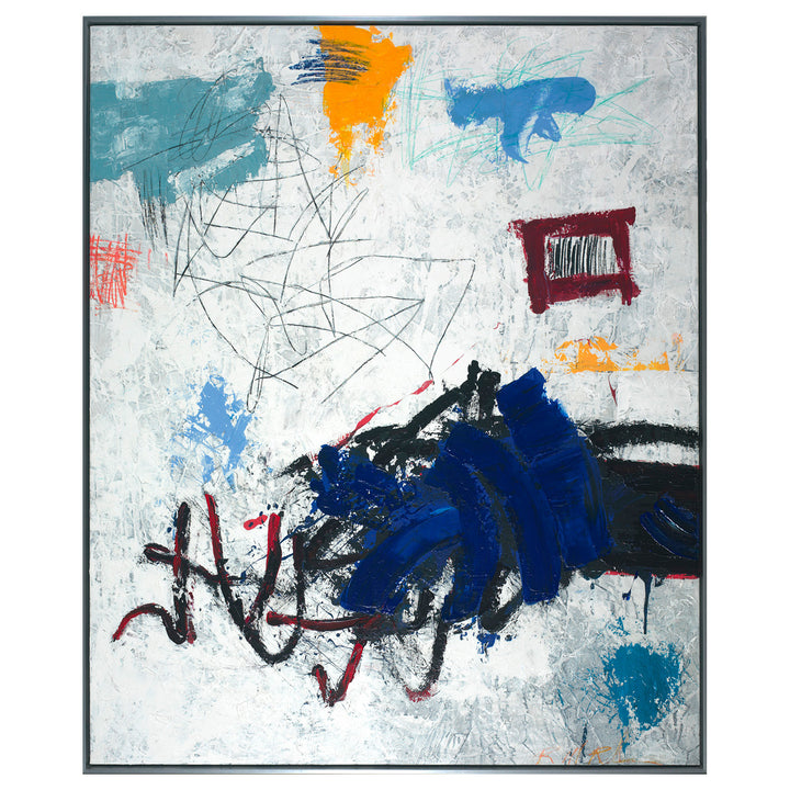 Here There Everywhere is mounted within a sleek floater frame that enhances its modern appeal making it an ideal statement piece for any setting that sparks conversation and invites the viewers to experience abstract expressionism with modern twist.