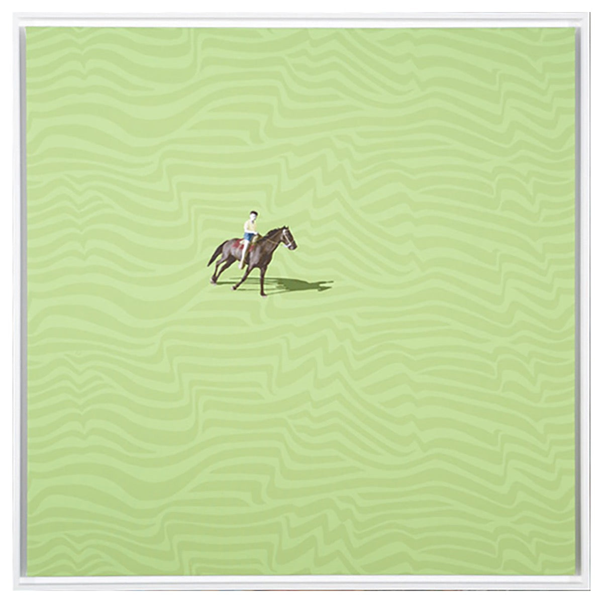 Elevate your spaces with the energetic energy of Johnny on a Pony 1, a striking Giclée print on canvas expertly created by a renowned artist Michael Wolk capturing the essence of movement and nature. . This masterpiece of artistry features a rider on a royal brown horse against a vibrant green background with wavy designs. Its colors and textures combination creates visually engaging effects that make Johnny on a Pony 1, a perfect addition to modern spaces.