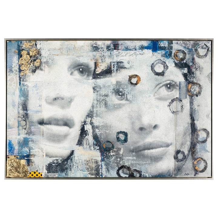 Elevate your modern spaces with an appealing mixed media painting Kate & Christy that blends abstract textures and dynamic brushstrokes. This hand-embellished giclee on canvas is featured with two lady faces in soft blues, grays and whites hues, with accents of circular patterns and yellow hints that create a sense of movement and depth.