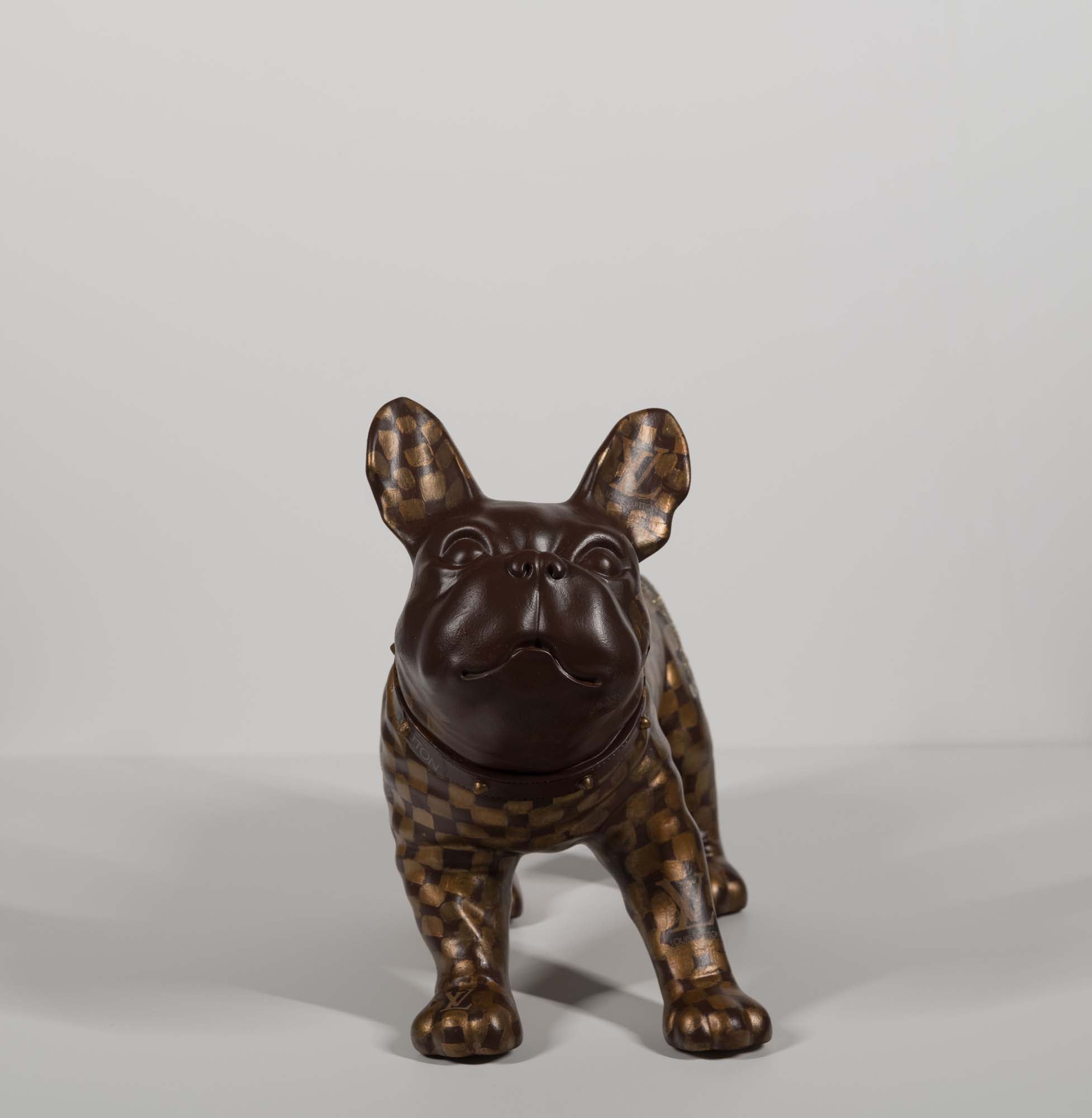 This PVC sculpture of a French Bulldog is hand painted with Louis Vuitton-inspired details, seamlessly blending high fashion with playful charm.