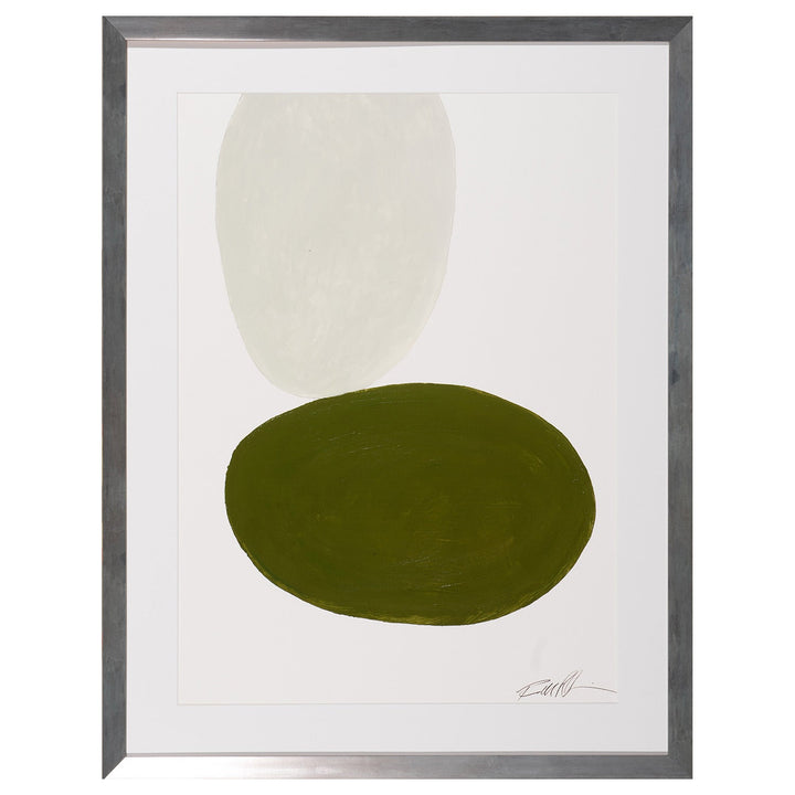Elevate your environment with the elegance of simplicity by adding Lucky Stones 3, a hand-embellished giclee on fine art paper that embodies harmony and sophistication. This abstract piece of artwork features two large oval forms in a soft off-white and a deep olive green shade set against crisp white background creating an intellect of balance and connection that draws the viewer’s attention.