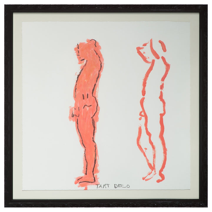 Tart Deco is hand-embellished giclee on fine art paper created by an artist Robert Robinson captures the contemporary abstraction with its composition. This abstract wall art features two sketches of silhouettes rendered in a lively reddish-orange tone. The bold brushstrokes with contemporary flair and vibrant contrast bring the portrait to life.