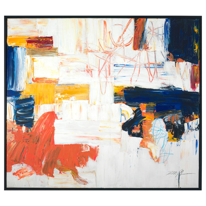 Pulp Free is a hand-embellished giclée on canvas that displays a dynamic fusion of color and movement through a bold and expressive abstract composition. The visually engaging piece of artwork features energetic brushstrokes in red, blue, yellow, orange and white hues layered with scribbled lines and textured areas adding depth and movement to the structure. The complex orange line patterns add a structured element, whereas the scattered brushstrokes reinforce a sense of spontaneity.