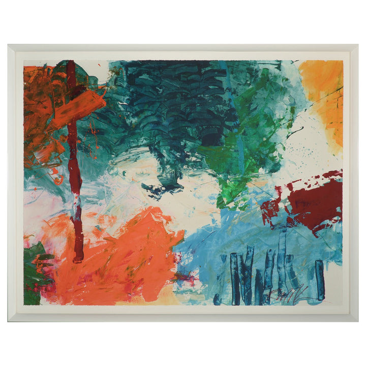 Redline is a hand-embellished giclee on fine art paper that bursts contemporary expression through its dynamic vibrant composition. This abstract artwork instantly captures the viewer’s attention with a vertically positioned bold red line that stands out against a backdrop of lively blues, greens and oranges. The engaging interplay of color and texture created by energetic brushstrokes and expressive splatters invites the viewers to explore its manifold layers of meaning.