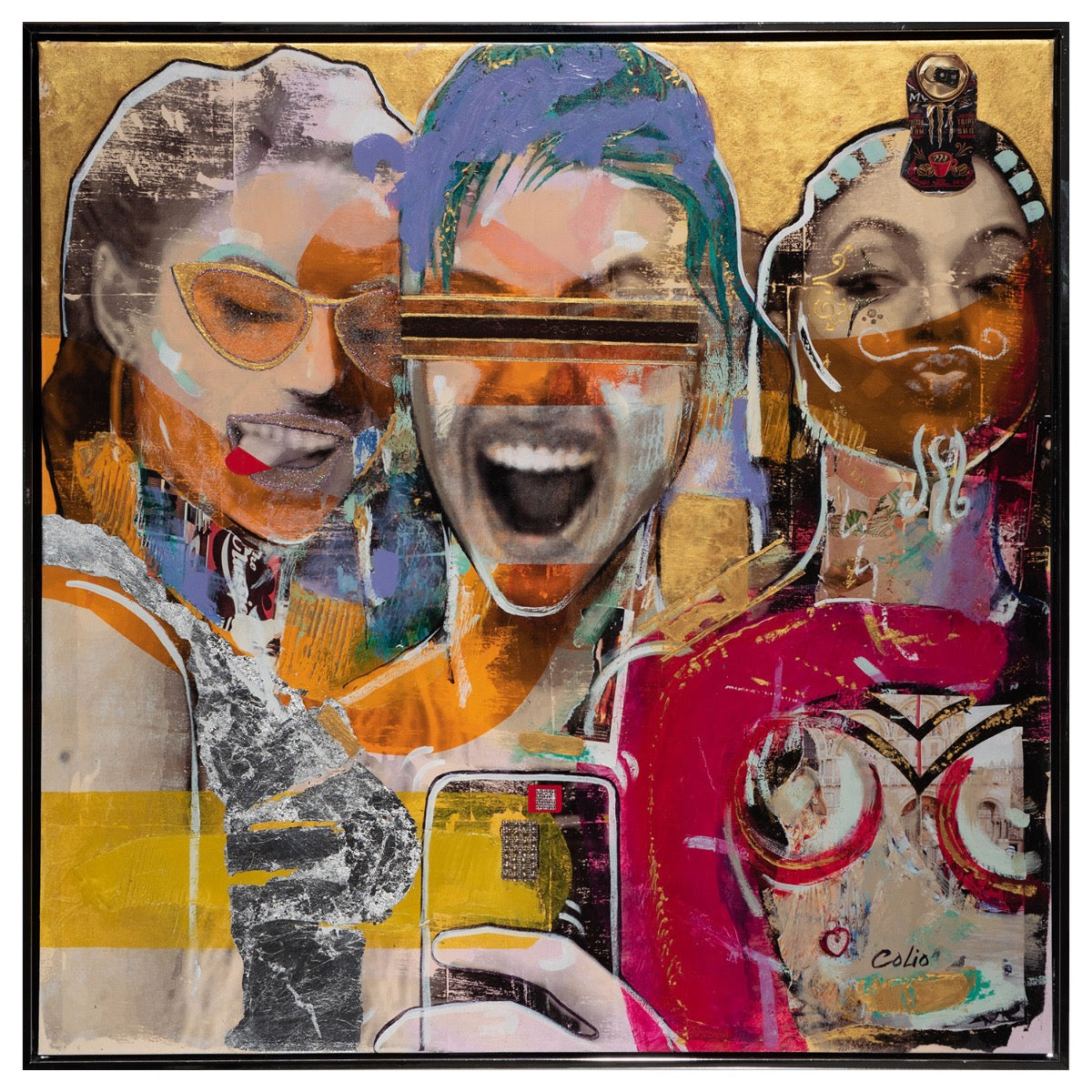 Say Cheese is a hand-embellished giclee on canvas that captures a playful blend of pop culture and abstract expression through its eye-catching composition. A mixed media artwork created by a talented artist Colio featuring three figures holding a smartphone in the way of taking a selfie, highlighting the acts of the digital age and the way we document our lives. The bold textures and striking contrasts enhance the elegance of this layered composition.