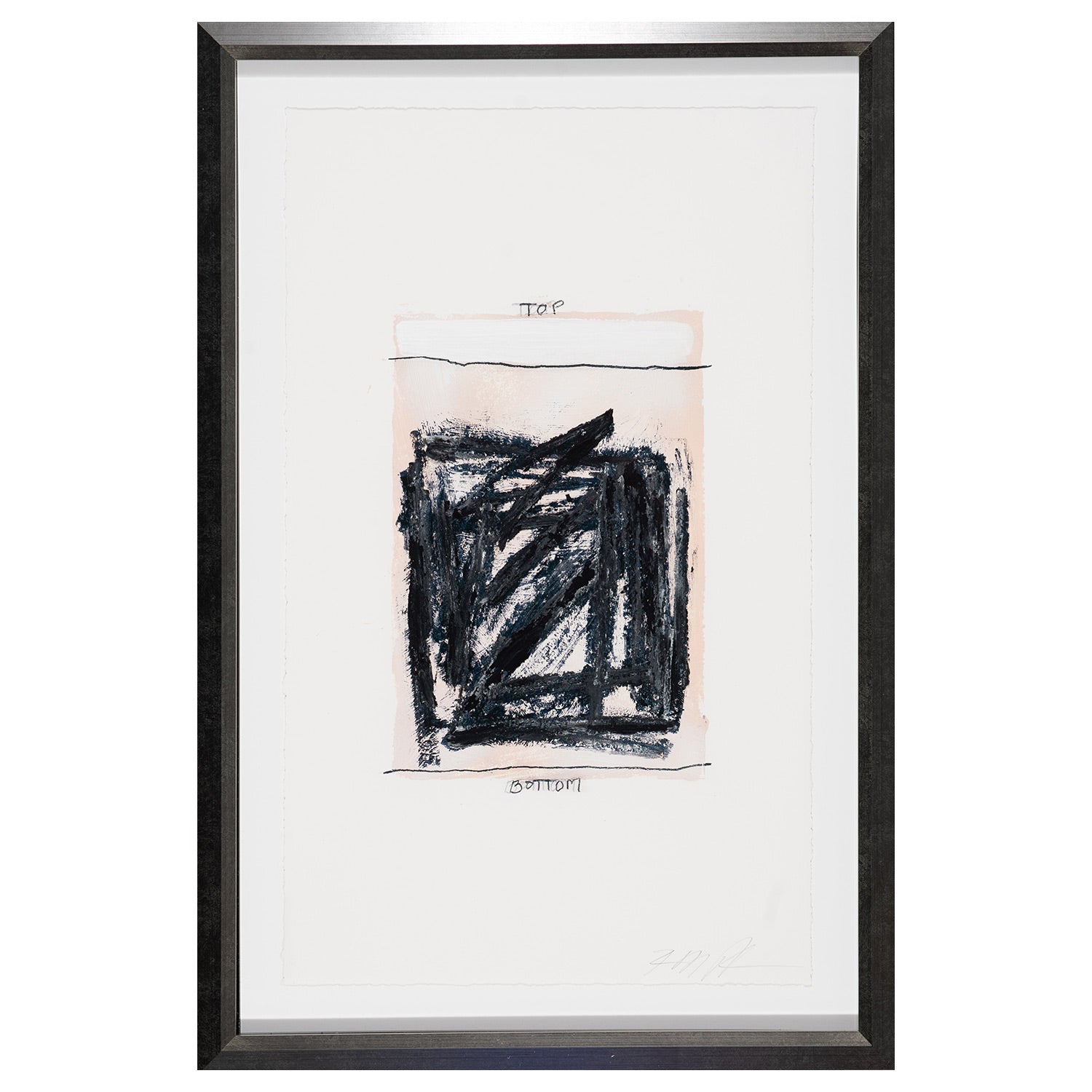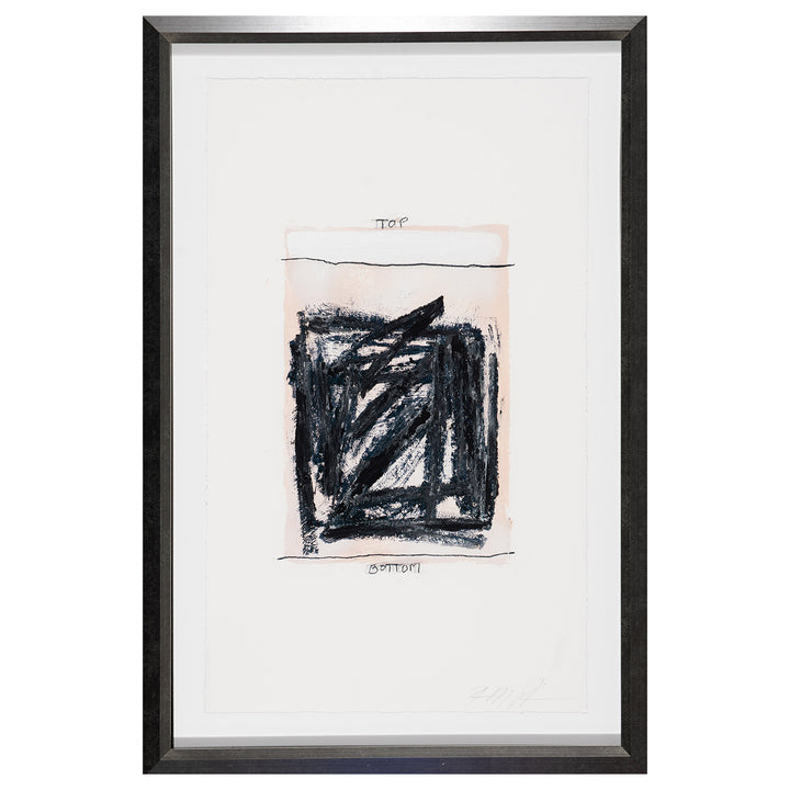School‚ÄîBottom Line is a hand-embellished giclee on fine art paper that features a centrally positioned square-like shape filled with rough black brush strokes surrounded by a light peach backdrop creating a heavily textured focal point. The handwritten words ‘TOP’ and ‘BOTTOM’ reflect the themes of structure or direction. Incorporation of textual and geometric themes exactly resonates with the layered approach to abstraction that draws attention.