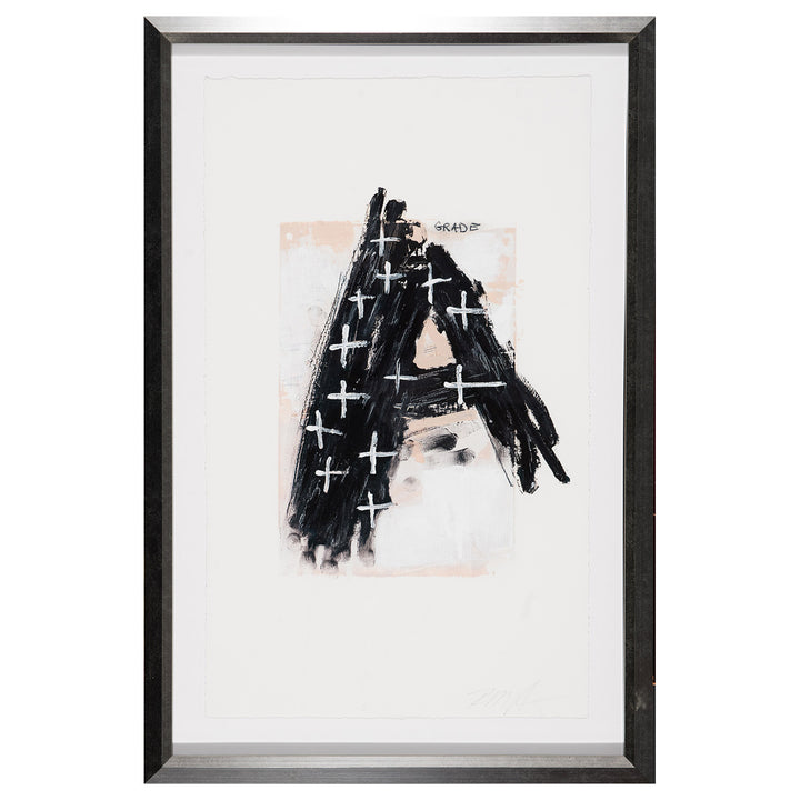 School‚ÄîGrade is a hand-embellished giclée on fine art paper that is featured with a bold blend of black brushstrokes and white cross marks creating a textured and layered structure. The dominant black angular shape and overlapping white crosses produce a textured and layered visual impact. The word ‘GRADE’ written at the top adds an exciting conceptual layer that reflects the themes of assessment, structure or evolution.