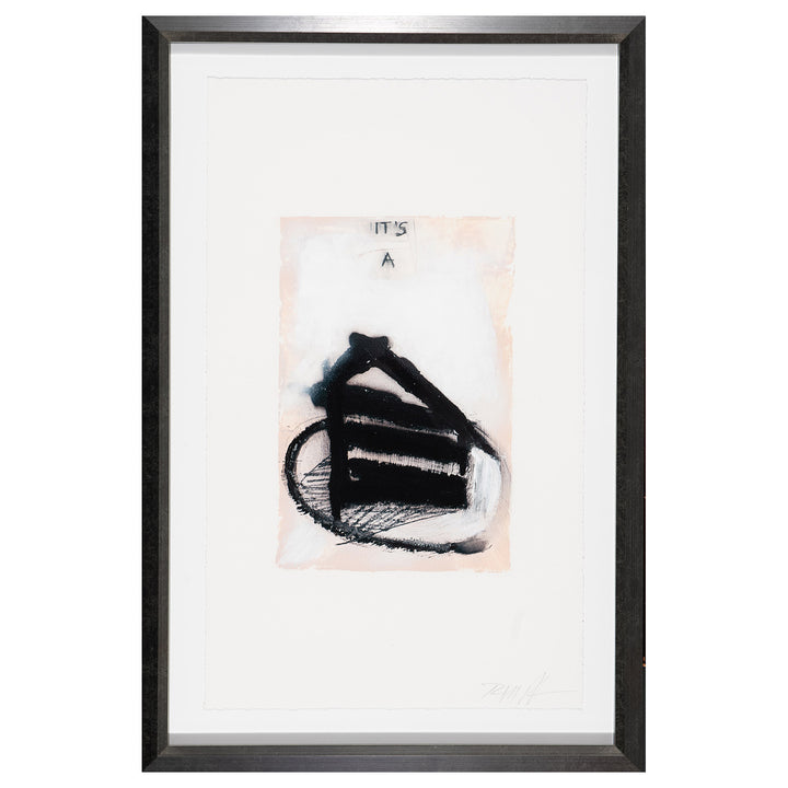 School‚ÄîPiece of Cake is a hand-embellished giclée on fine art paper that captures a bold blend of black brushstrokes and structured text elements. The abstract piece of artwork is featured with a large black geometric shape looking like a slice of cake placed on a plate, with three horizontal lines inside and a rounded outline at the bottom. The handwritten text ‘IT'S A’ presents a fascinating conceptual element, perhaps emphasizing the themes of identity or abstraction.