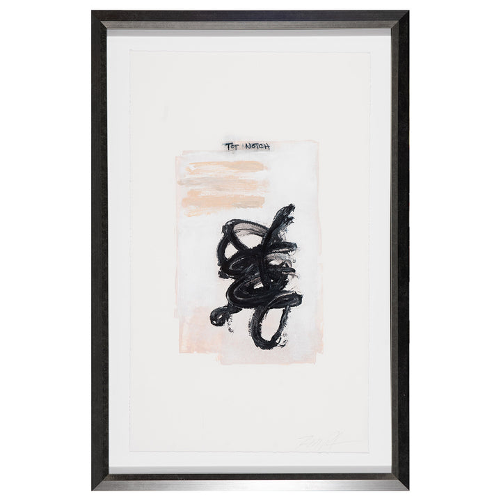 School‚ÄîTop Notch is a hand-embellished giclée on fine art paper that embodies strength and fluid motion. This bold and dynamic abstract artwork features thick, black swirling brushstrokes layered over a clean white background that create a striking visual impact. The text ‘TOP NOTCH’ written in black over the dramatic brushwork heightens the theme of excellence and distinction. The light beige brushstrokes around the central black pattern add warmth and texture to the structure.