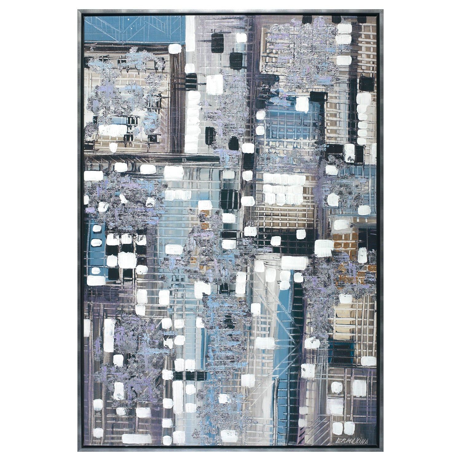 Serenity 2 is a giclee on canvas hand-embellished with gold leaf that showcases a fascinating blend of geometric forms and layered textures. The abstract piece of artwork is featured a grid-like pattern of rectangles and upright structures, seem like an abstract cityscape. The prevailing color palette comprises on blue, gray, white and brown shades create an urbane and soothing atmosphere that draws viewer’s attention.