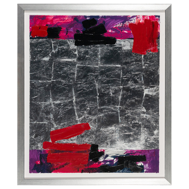 Silver Statement 1 is a giclée on fine art paper hand-embellished with silver leaf that showcases dynamic fusion of texture and contrast. This abstract piece of artwork is featured with a textured backdrop with a grid-like pattern in black and gray shades. This masterpiece contains bold irregular patches of red and black paint accented with some purple splashes adding depth and contrast to the piece. The red, purple and black tones at upper and lower sections create a visually striking fusion of colors.