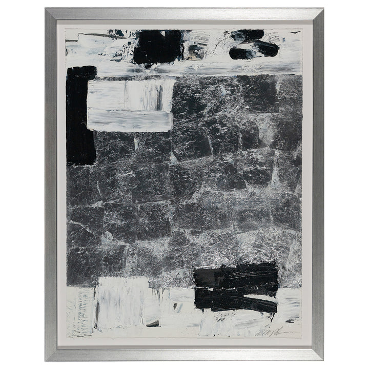 Silver Statement 2 is a giclée on fine art paper hand-embellished with silver leaf that features a textured structure with black, white and gray hues. The abstract piece of artwork integrates rectangular forms and layered brushstrokes which create a lively interplay of depth and movement. The silver frame balances the monotonic color scheme, enhancing its sophisticated aesthetic.