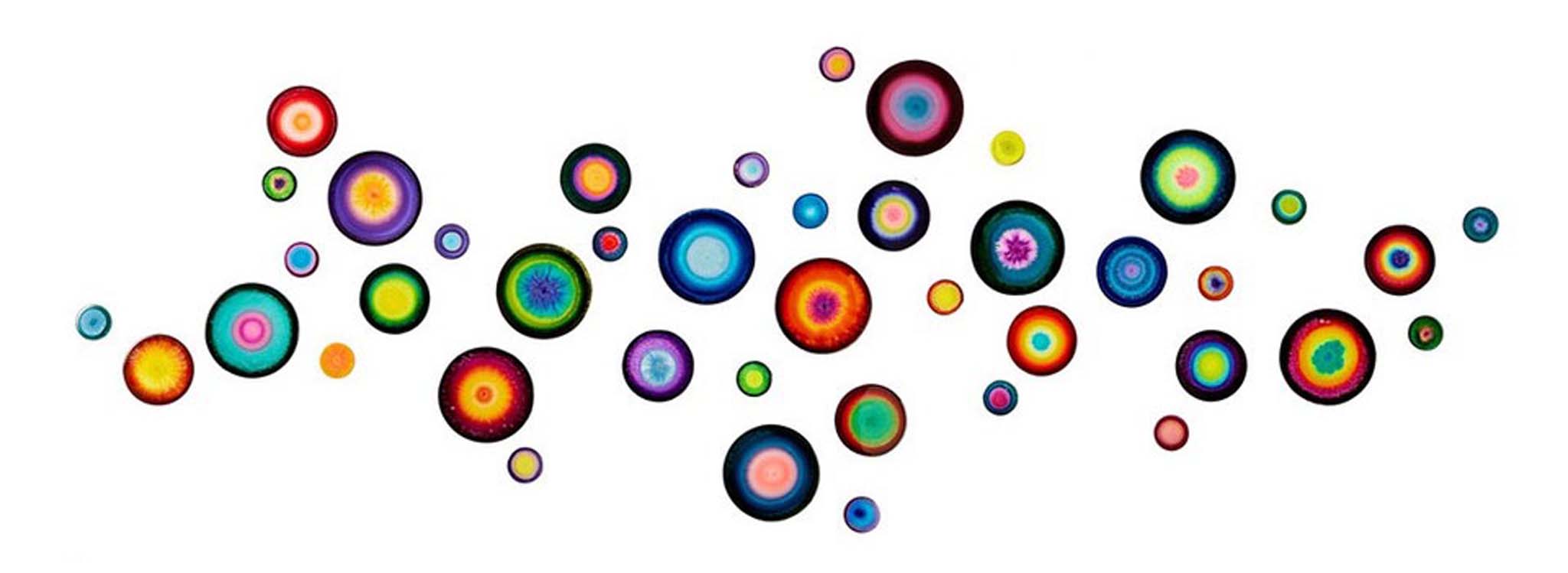 This set of 42 resin and ink wall sculptures is hand painted by artist Allison Esley. Each set contains 20 three-inch, 11 six-inch and 11 eight-inch wall sculptures which can be hung as shown or in any desired configuration.
