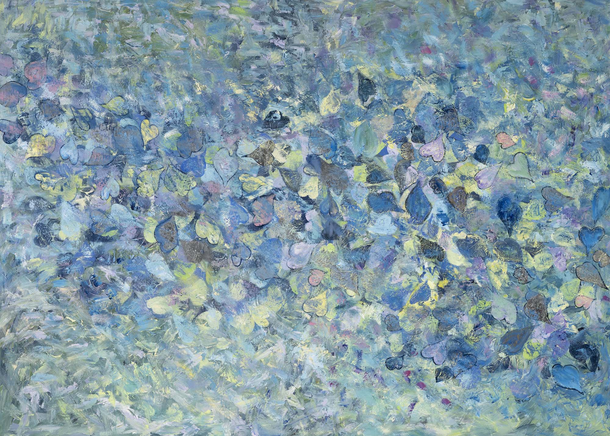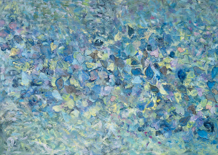 This hand-embellished gallery-wrapped canvas features delicate silver leaf hearts against a background of serene blues and greens to add a touch of elegant sophistication and a sense of calm to any space.