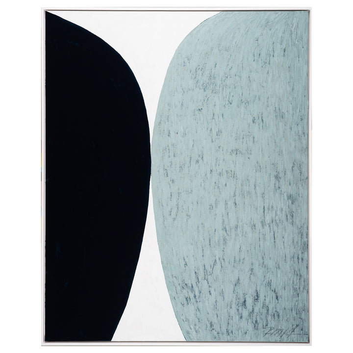 Stone Shadow is a hand-embellished giclée on canvas created by a talented artist Robert Robinson that presents a refined interplay of texture and depth. This abstract painting is featured with two different curved shapes in solid black and textured light blue hues set against a clean white background that create a fascinating visual balance. The textured effect on the light blue shape and the bold minimalism of the black form create a subtle but engaging contrast that adds a touch of movement to the piece.