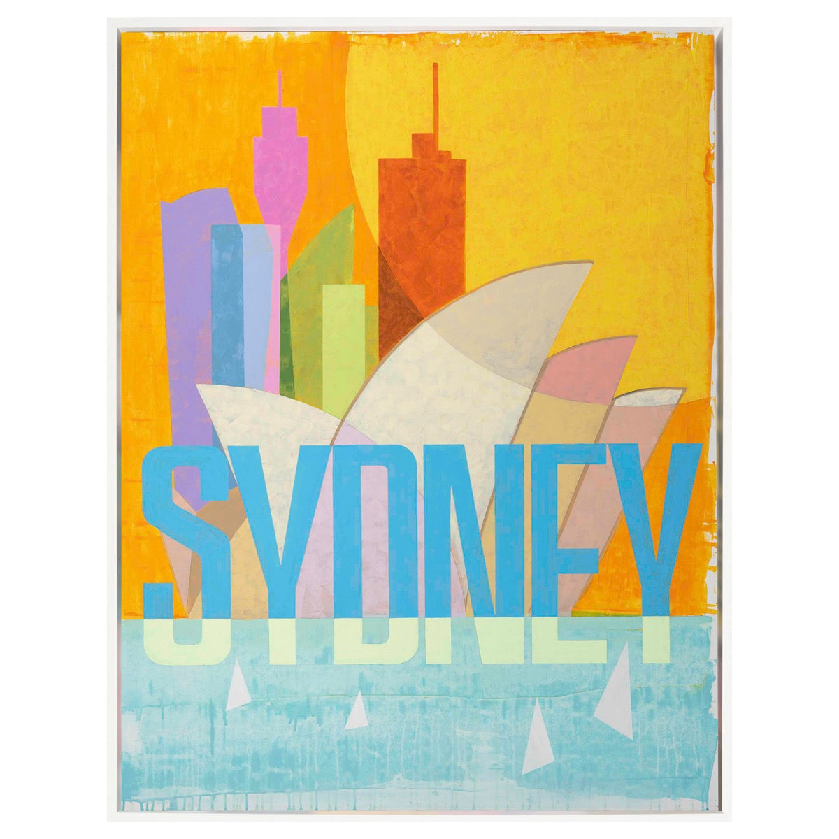 The iconic buildings and the Sydney Opera House are beautifully highlighted in multiple colors. Unique skyscrapers stand in green, purple, and orange in a yellow sky with the word “SYDNEY.” This is the iconic skyline of Sydney developed through the vibrant and dynamic creation of Robert Robinson.