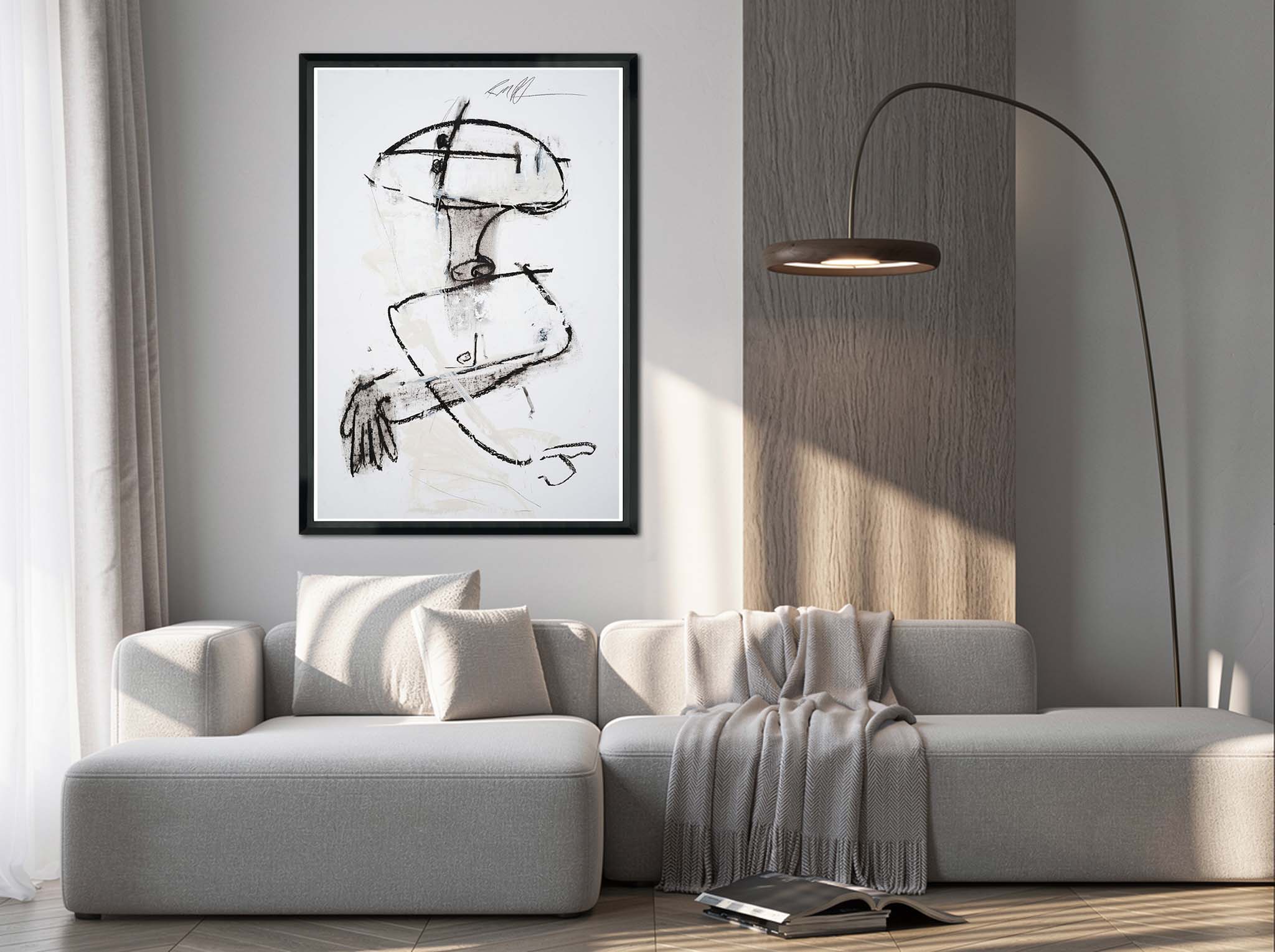 Bold strokes of black on white create the Cubist-inspired head and torso in this hand-embellished giclŽe print by artist Robert Robinson hand-framed in a black, wooden frame.