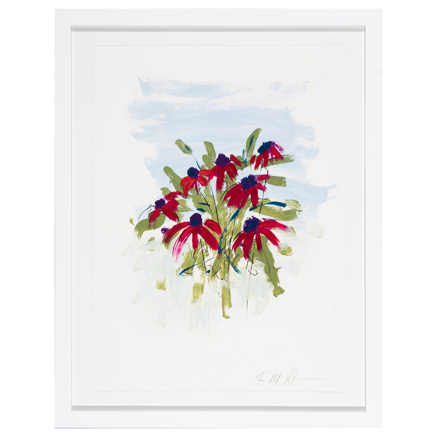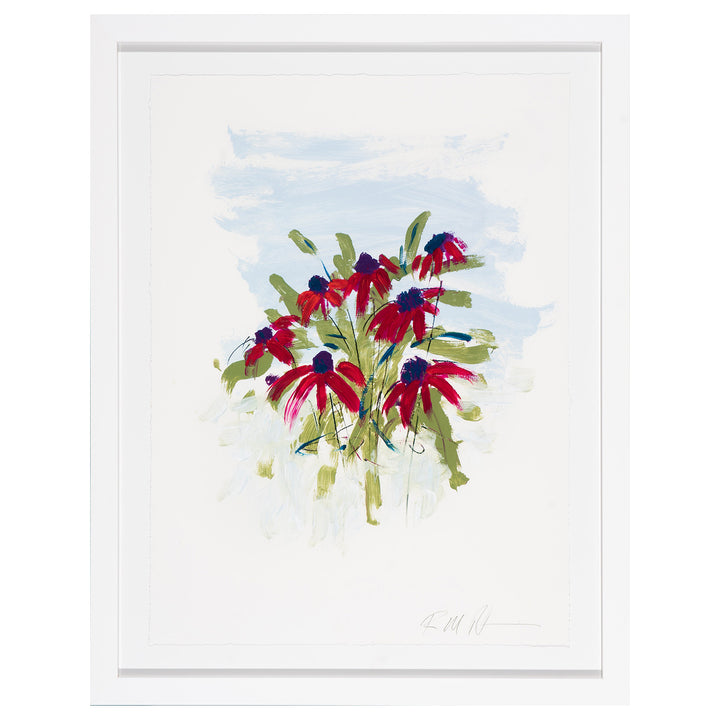 White Glove Series—Cones is a striking floral painting that showcases the vibrancy and movement of flowers through its captivating design. This hand-embellished giclee on fine art paper is featured with a bouquet of lively red flowers with deep blue centers, emphasized with lush green foliage, all set against a soft blue and white backdrop that evokes fresh and sophisticated feel.