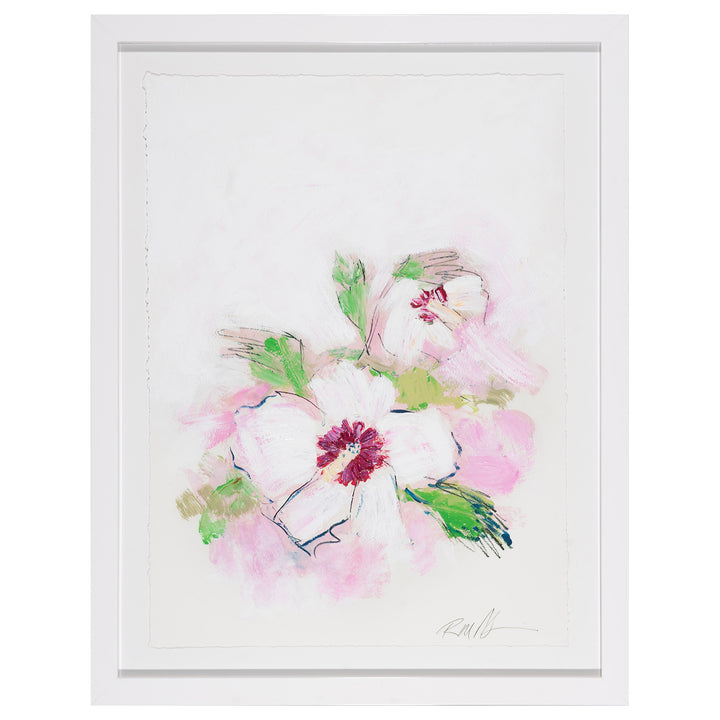 White Glove Series‚ÄîRose of Sharon is a hand-embellished giclée on fine art paper that presents a delicate yet expressive floral structure precisely created by a talented artist Robert Robinson. This masterpiece piece of artistry features soft organic brushstrokes with intricate details that heighten the natural beauty of the flower and bring the Rose of Sharon to life. The subtle use of hues in gentle whites, muted greens and refined earthy tones create a calm and elegant visual experience.